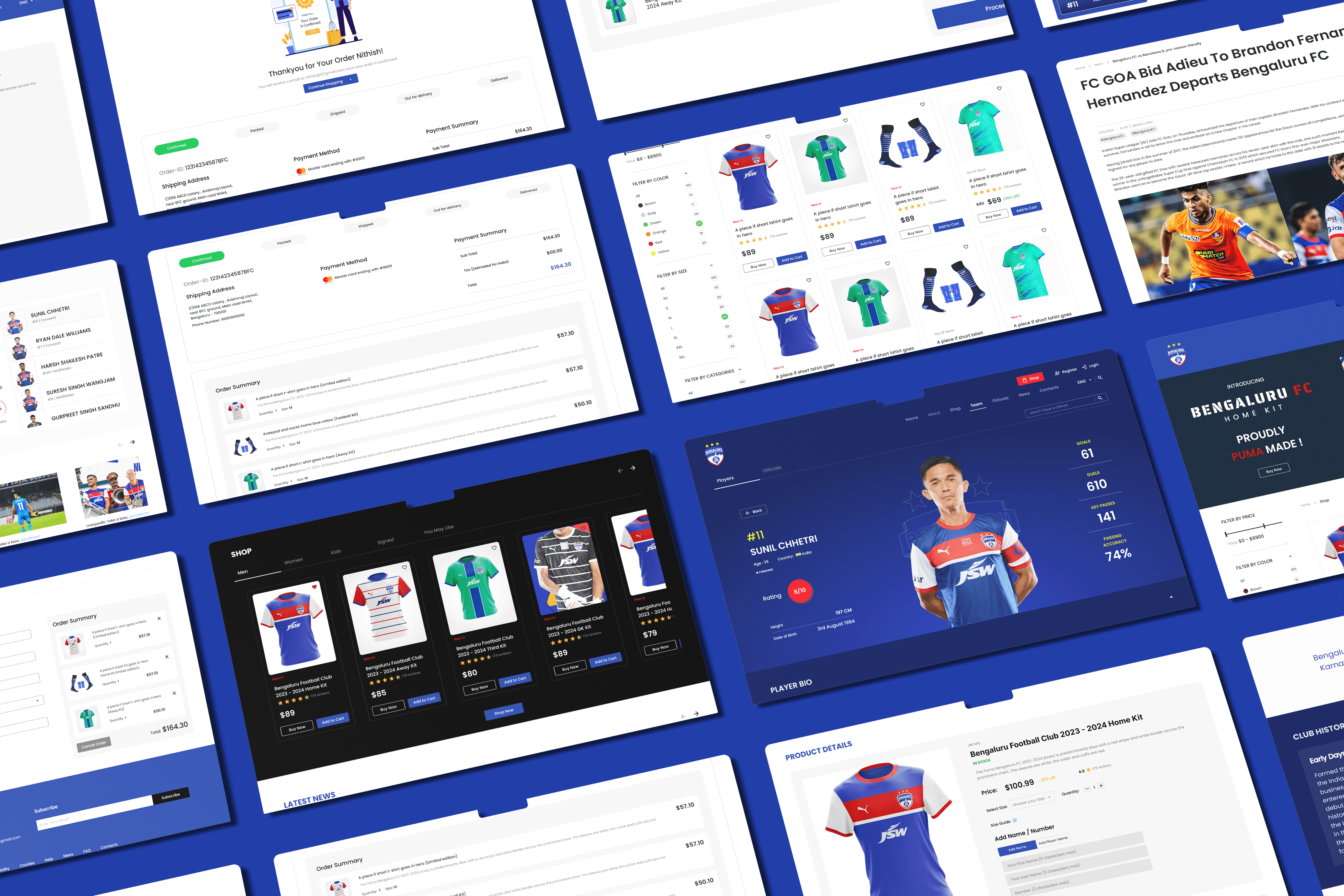 We designed a unified, fan‑first web experience for Bengaluru FC that blends live football energy with seamless shopping and data-rich storytelling. The proposal delivers a scalable design system and complete journey coverage: Home, Fixtures and Match Detail, Team and Player Profiles, News, Shop (PLP/PDP), Cart, Checkout, and Order Confirmation.