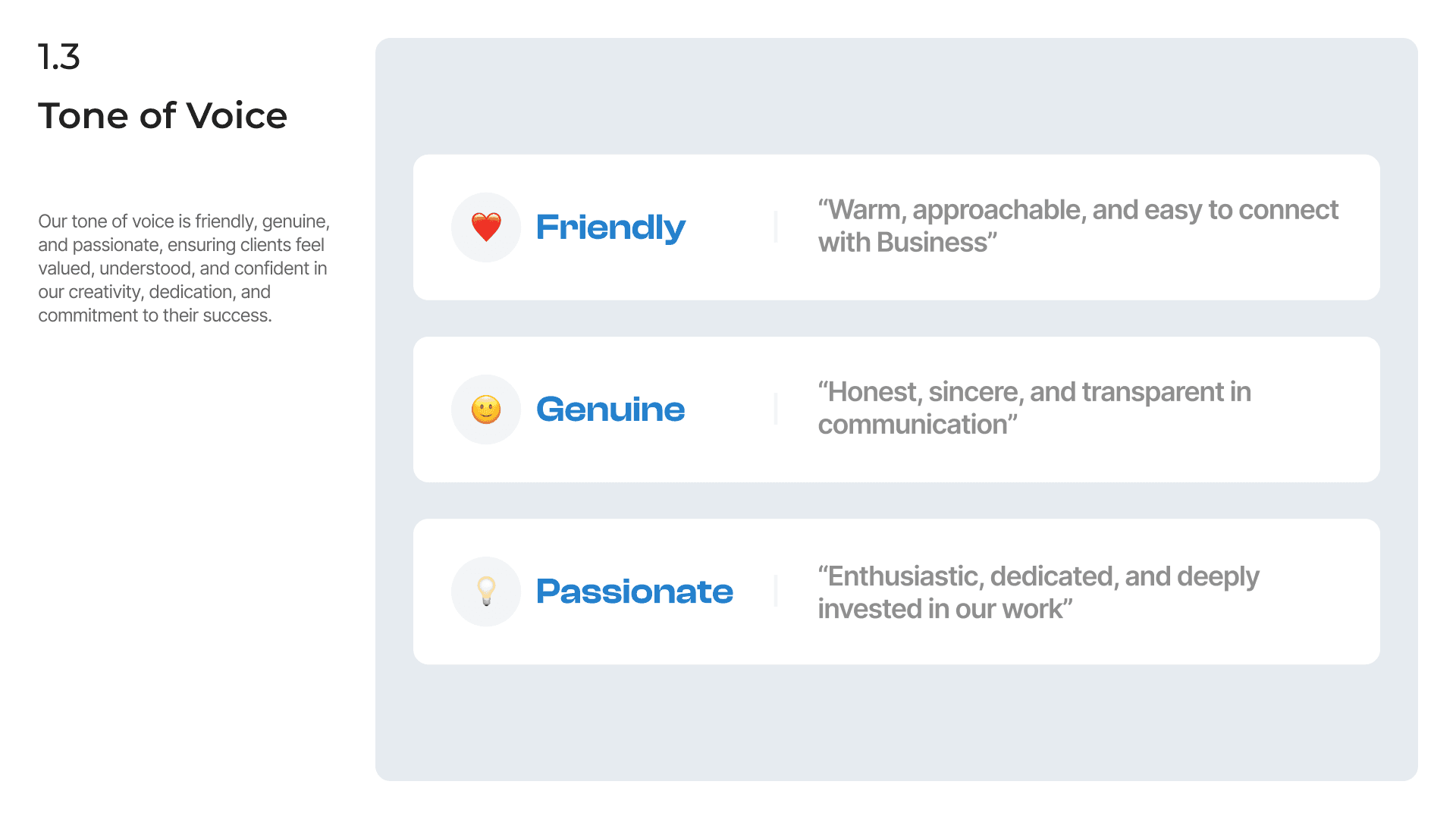 We defined three core pillars for the brand's voice—Friendly, Genuine, and Passionate—which became the north star for all visual and written design decisions.