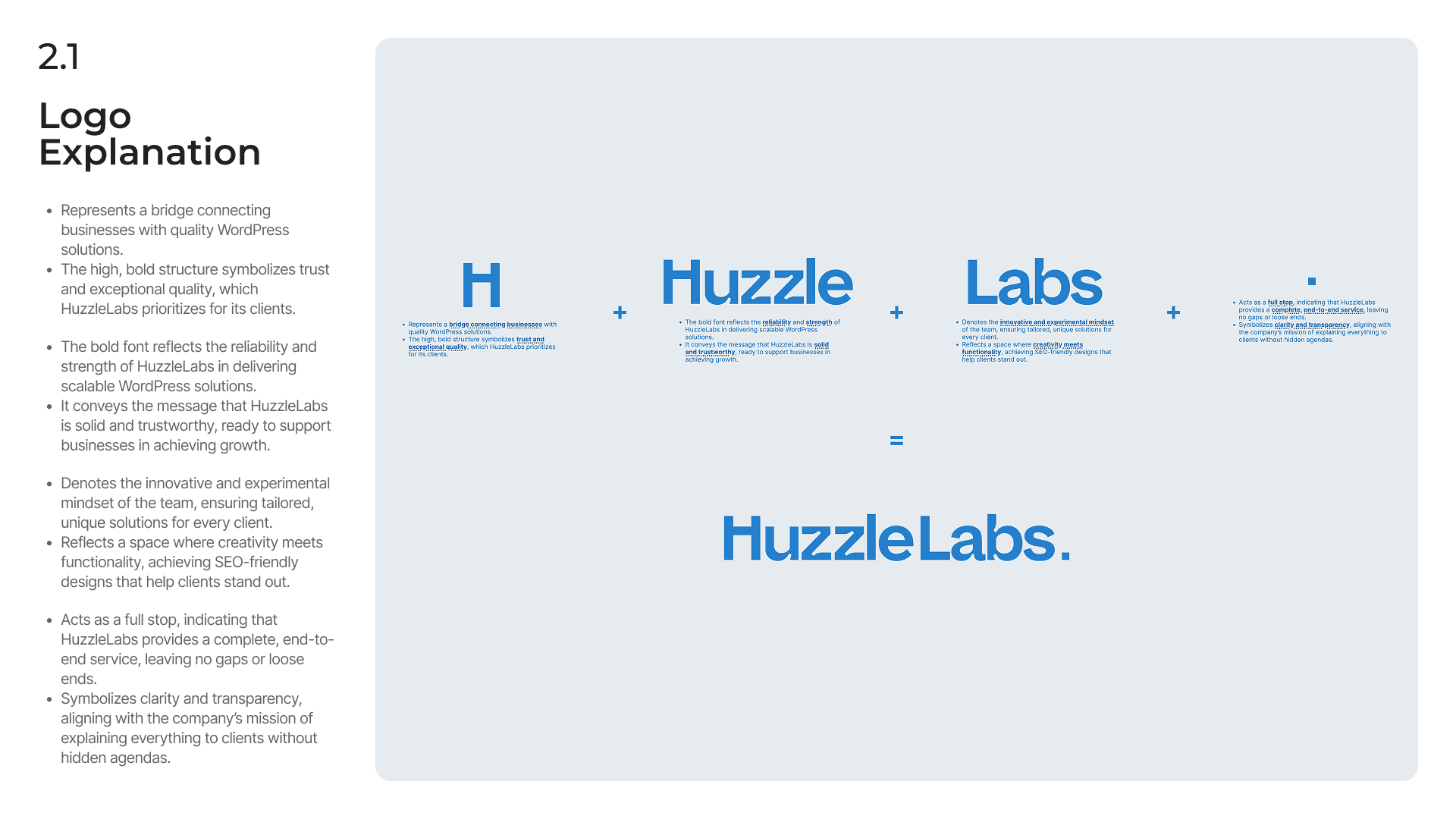 A brand identity is only effective if it's used correctly. The final and most critical deliverable was a comprehensive set of brand guidelines. This document empowers the HuzzleLabs team to be self-sufficient and maintain brand integrity across all touchpoints.